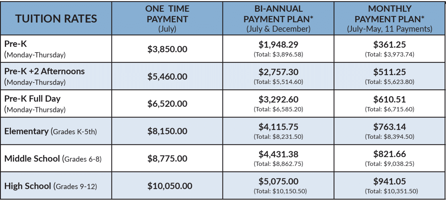 Our 2026-2027 school year tuition rates are available above, and you can download the full page by clicking HERE. We offer a range of tuition options tailored to meet the needs of families with children in Pre-K through high school. Tuition Assistance and Payment Plans Available